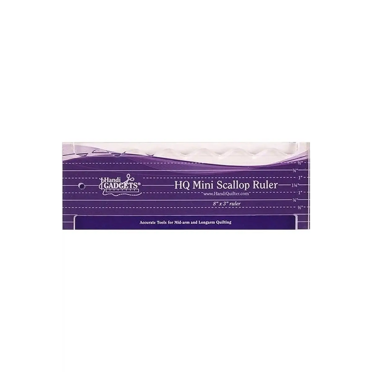 Ruler Mini Scallop. Made from .25-inch thick quality acrylic. This 8 x 3 Mini Scallop ruler is for perfect mini-clamshells. Use the straight side for stitch-in-the-ditch. Ruler packaging includes instructions for use safety tips and design ideas. Use with the HQ Ruler Base.
