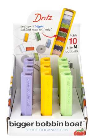 ll ensure bobbins remain neatly stowed and tangle-free. Eye-catching counter display to encourage multiple unit purchase. Pre-loaded with nine Bigger Bobbin Boats in three pastel colors. Each boat holds ten size M bobbins. Curved interior “hugs” bobbins securely in place. Size: M Use: Bobbin Organizer