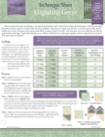 Discover the art of quilting with the 'Migrating Geese' technique sheet, a favorite among quilters for its simplicity and versatility. This guide, authored by the renowned teacher and author Georgia Bonesteel, introduces you to a method that can be adapted to various fabrics, offering endless creative possibilities. Whether you're a beginner or an expert, this sheet provides clear instructions on cutting, piecing, and assembling your quilt blocks, ensuring a professional finish every time. The technique involves creating dynamic, flying geese patterns, which are visually striking and can be customized with different color schemes and fabric choices. Enhance your quilting projects with this innovative approach, making your creations stand out with precision and style. Technique Sheet for quilting Authored by Georgia Bonesteel Suitable for various fabric types Provides cutting, piecing, and assembly instructions Features dynamic flying geese patterns Customizable with different colors and fabrics Enhances quilting projects with precision and style