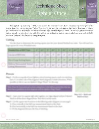 Discover the art of precision quilting with this technique sheet designed to guide you through crafting eight half-square triangles at once. This guide simplifies the process by providing clear instructions and diagrams, ensuring you can produce multiple units efficiently. The vibrant purple and green color scheme adds a touch of elegance, while the structured layout with step-by-step visuals helps in mastering the technique. Whether you're a seasoned quilter or just starting, this sheet is your key to enhancing your quilting projects with accuracy and ease. Title: Eight at Once Purpose: Making multiple half-square triangles simultaneously Features: Step-by-step instructions, visual diagrams Design: Purple and green color scheme Ideal for: Quilters of all skill levels