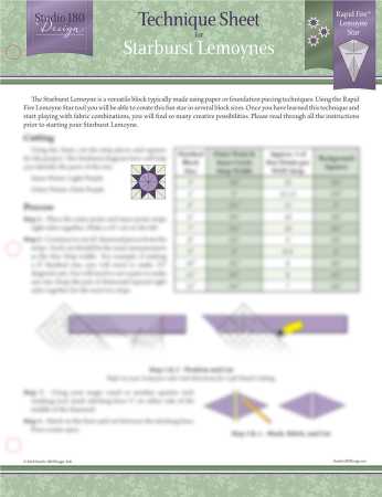 Explore the art of quilt making with this comprehensive technique sheet for crafting the Starburst Lemoyne block. This guide provides detailed instructions on using paper or foundation piecing techniques to create a visually stunning block, featuring a starburst design within a Lemoyne star. The sheet includes a vibrant example of the Starburst Lemoyne block in shades of purple and green, demonstrating the intricate geometric patterns and color combinations possible. Perfect for quilters looking to enhance their skills or add a unique touch to their projects, this technique sheet ensures you can achieve professional results with ease. Technique Sheet for Starburst Lemoyne block Instructions for paper or foundation piecing Features starburst design within a Lemoyne star Includes example in purple and green Ideal for quilters of all skill levels No promo code provided