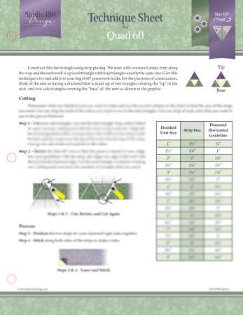 Our Quad 60 Technique Sheet, a companion for the Star 60 tool, will add a fun new triangular unit to your bag of 60° piecework tricks! Each diamond is made up of two triangles, so when you add the side triangles you have four triangles in the unit. Now that’s sure to add some sizzle to your designs! Starting with an oversized strip piecing technique, followed by trim down steps using the Star 60 tool, you’ll be amazed at how quickly these units come together.