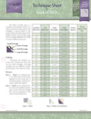This creative variation of the Shaded Four Patch is easily constructed using basic squares and rectangles. In the Shaded Four Patch unit you have a plain square in the corner, but Flock of Birds replaces it with a pieced square, creating a fun new take on the classic unit! So bust out those Tucker Trimmer IIs and IIIs, consult the convenient Flock of Birds chart, and go with the flock! DETAILS One page, laminated for durability Three-hole punch for storage Companion for the Tucker Trimmer® II and III Twenty three unit sizes from 1” to 12” finished Free online video for unit construction and tool trim down (Coming soon!) Left Handed trimdown instructions available for download Printed Paper Pattern Finished Size: Multiple Final Product: Quilt Technique Used: Standard Machine Sewing Skill Level: Intermediate