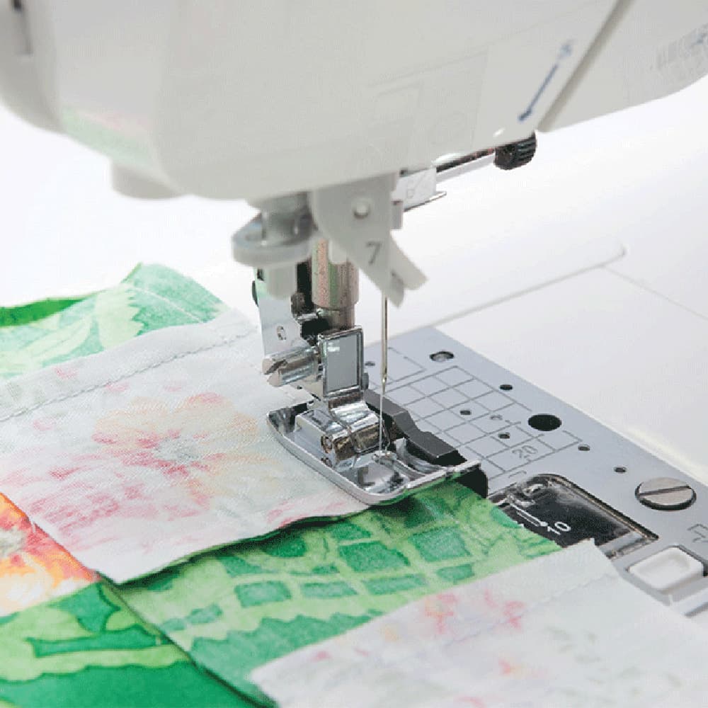 The 1/4" Guide Foot is used for piecing together patchwork with a seam allowance of 1/4" or 6.4mm. With your needle set to center straight stitch, line up the edge of the fabric with the 1/4" Guide Foot, and you will produce a 1/4" seam allowance.