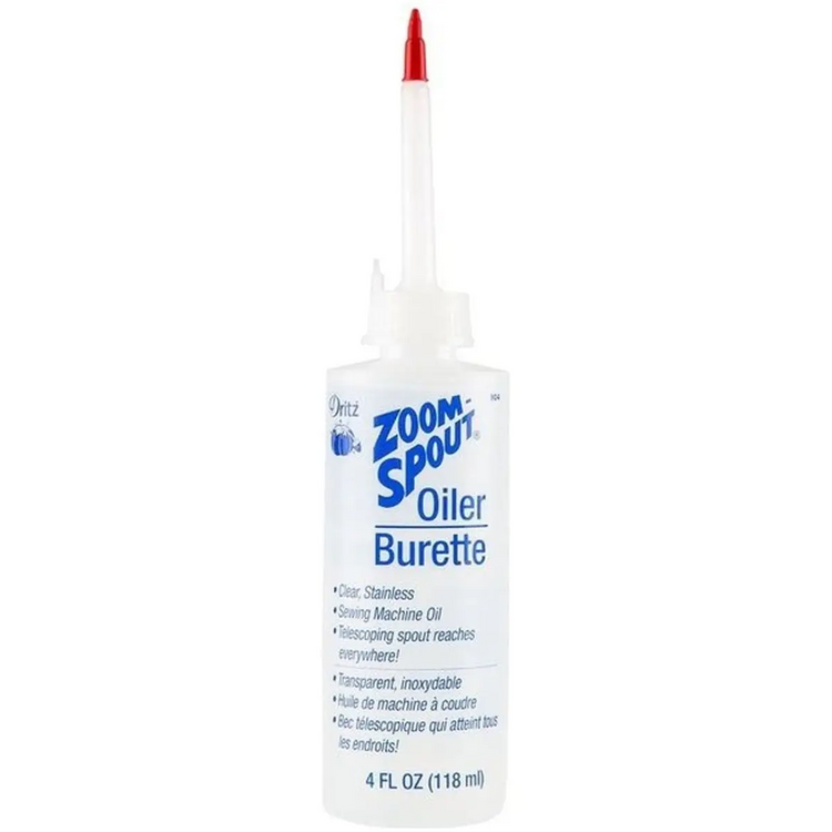 This Nifty Notions Zoom Spout Oiler has a convenient, extendable spout that is ideal for those hard-to-reach areas. Apply this high-quality, stainless (Lily White) sewing machine oil to keep your machine in good running condition. This non-toxic, non-gumming, and non-staining lubricant will help prevent rust damage and will keep dust and dirt particles from forming in your machine. Once you have lubricated your machine, it is our recommendation that you use a scrap piece of fabric to sew on until the excess oil is gone. Whether you use your sewing machine daily or just occasionally, oiling your machine is important and will help extend the lifespan of your sewing machine. (Bottle my come in blue or brown.)