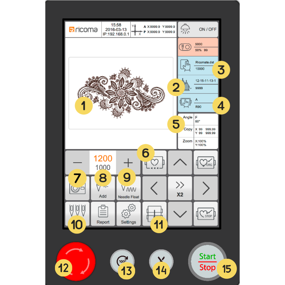 View the machine’s status, and rewind or fast forward the design in low or high speeds.