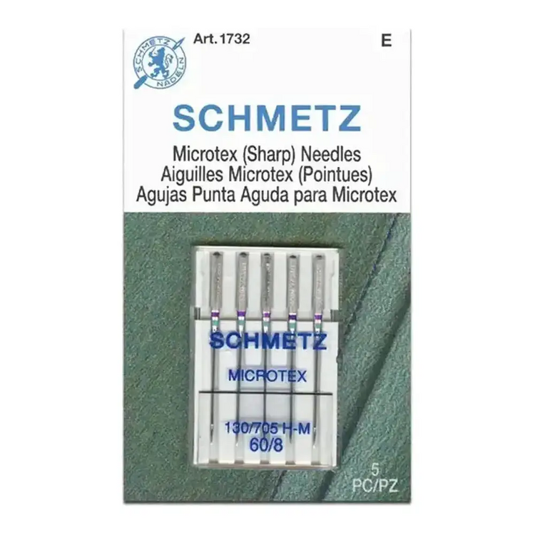 The SCHMETZ Microtex sewing machine needle is generically known as a "sharp" needle. The very slim acute point creates beautiful topstitching on fashion sewing and perfectly straight stitches for piecing and quilting. Use the SCHMETZ Microtex when precision is paramount.