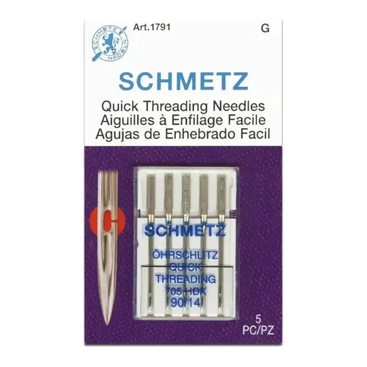 The SCHMETZ Quick Threading needle is a Universal needle with an easy-to-thread slot in the eye. Reduce sewing speed so the thread does not pop out of the eye. Avoid using on sensitive fabrics because the slot may snag the fabric. Do not use for quilting as the batting may pull. Not recommended for sewing denim, as the eye structure is too weak. The SCHMETZ Quick Threading needle is compatible with wovens and knits, but test first.