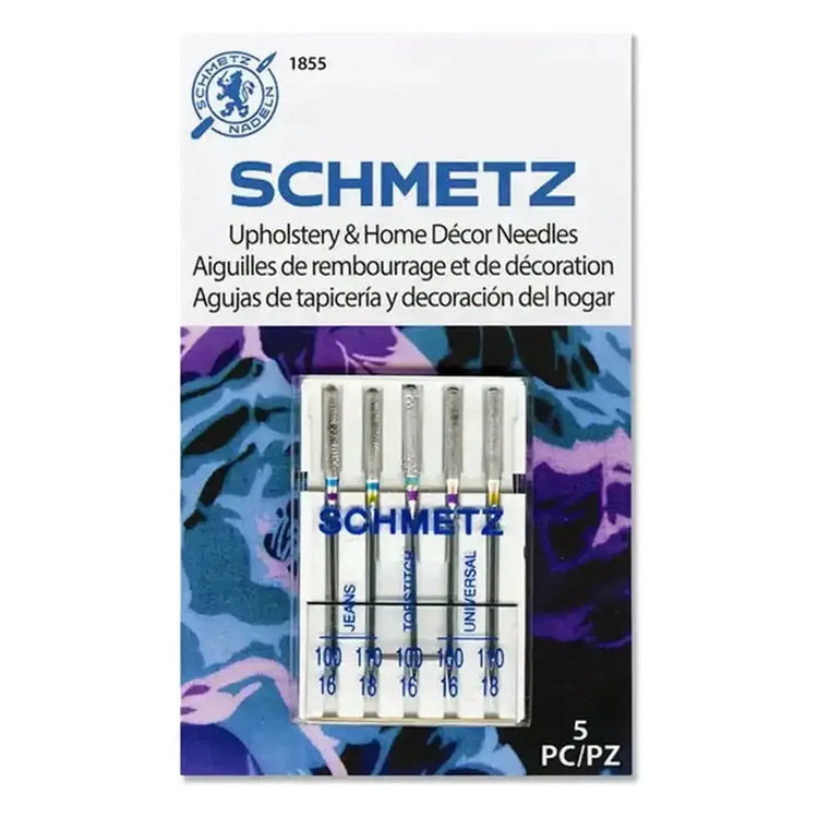 The SCHMETZ Upholstery & home combo pack includes assorted needles for heavy duty projects. Skipped stitches reduced by Denim reinforced blade. Shredded & broken threads lessened by Topstitch elongated eye. Multiple project uses by Universal.