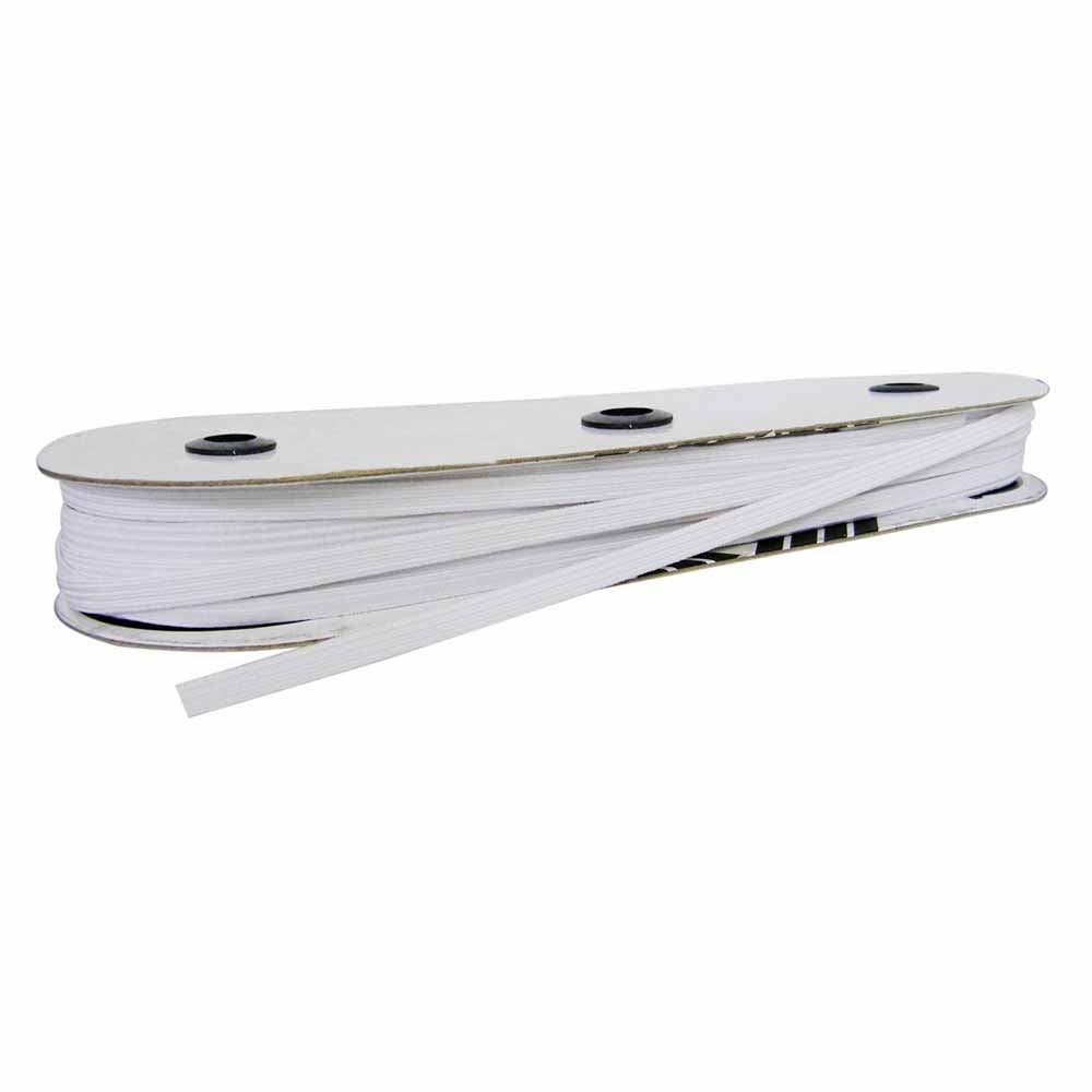 A general all purpose elastic. Excellent “stretchability.” Narrows when stretched. Avoid stitching through. Use in a casing for waistbands, sleeves and necklines. White.
