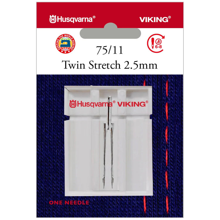 The HUSQVARNA® VIKING® Stretch Twin Needle is designed for perfectly parallel topstitching on stretch and knit fabrics. Featuring two 75/11 needles set 2.5mm or 4.0mm apart, this needle ensures flexible, durable stitching on stretchy materials such as jersey, spandex, and elastic fabrics. The medium ballpoint tip glides smoothly between fabric fibers, preventing skipped stitches and fabric damage. It's perfect for hemming T-shirts, activewear, and other stretch garments. Each pack includes one premium-quality needle in size 75/11, ideal for lightweight to medium-weight stretch fabrics. For optimal performance, replace your needle every 6 to 8 hours of sewing or whenever you switch fabric types.