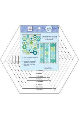 You Hexie Thing by June Tailor just made cutting the popular hexagon shape easier! This slotted ruler cuts perfect hexagon shapes in seven different sizes quickly and easily. These slots have tear drop guides for easy insertion of rotary cutters and precise cutting. The ruler is marked with alignment guides and tells strip size needed for 1-1/2" finished up to 4-1/2" finished hexagons.